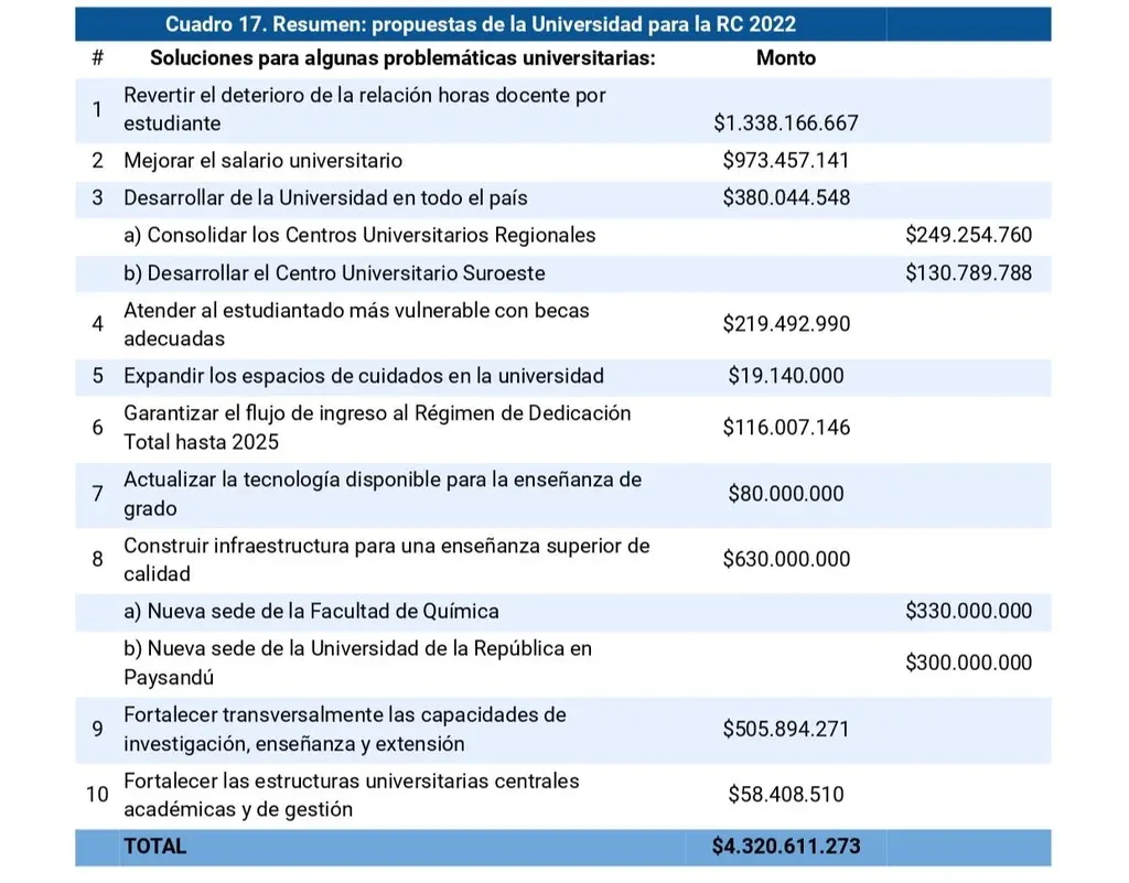 Más de dos meses antes de la fecha límite que exige la normativa, con la votación unánime de los 18 integrantes del Consejo Directivo Central, la Universidad de la República (Udelar) aprobó este viernes su proyecto de Rendición de Cuentas. En esta oportunidad —la última en la que se puede aumentar gasto en este gobierno— la institución le pedirá al Parlamento $ 5.161.845.513 (más de US$ 113 millones al valor de cambio actual).