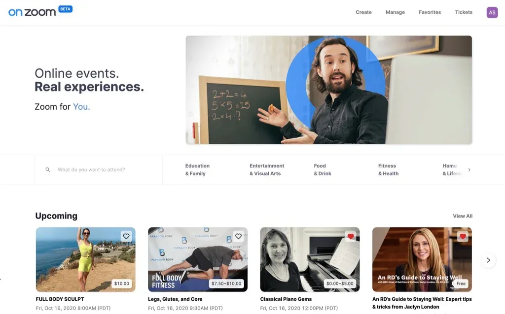 Se trata una extensión de Zoom enfocado a eventos en línea. Clases de fitness, conciertos, lecciones de música… los usuarios podrán organizar eventos gratuitos, pagos y de recaudación de fondos gracias a las nuevas funciones de monetización que ofrece la extensión. Se podrán programar eventos hasta para 1000 asistentes, listar y vender entradas, comprar y regalar boletos, compartir y calificar eventos. Desde el 14 de octubre estará disponible una versión beta, pública para los usuarios de EEUU. Se prevé que se extienda al resto del mundo próximamente.