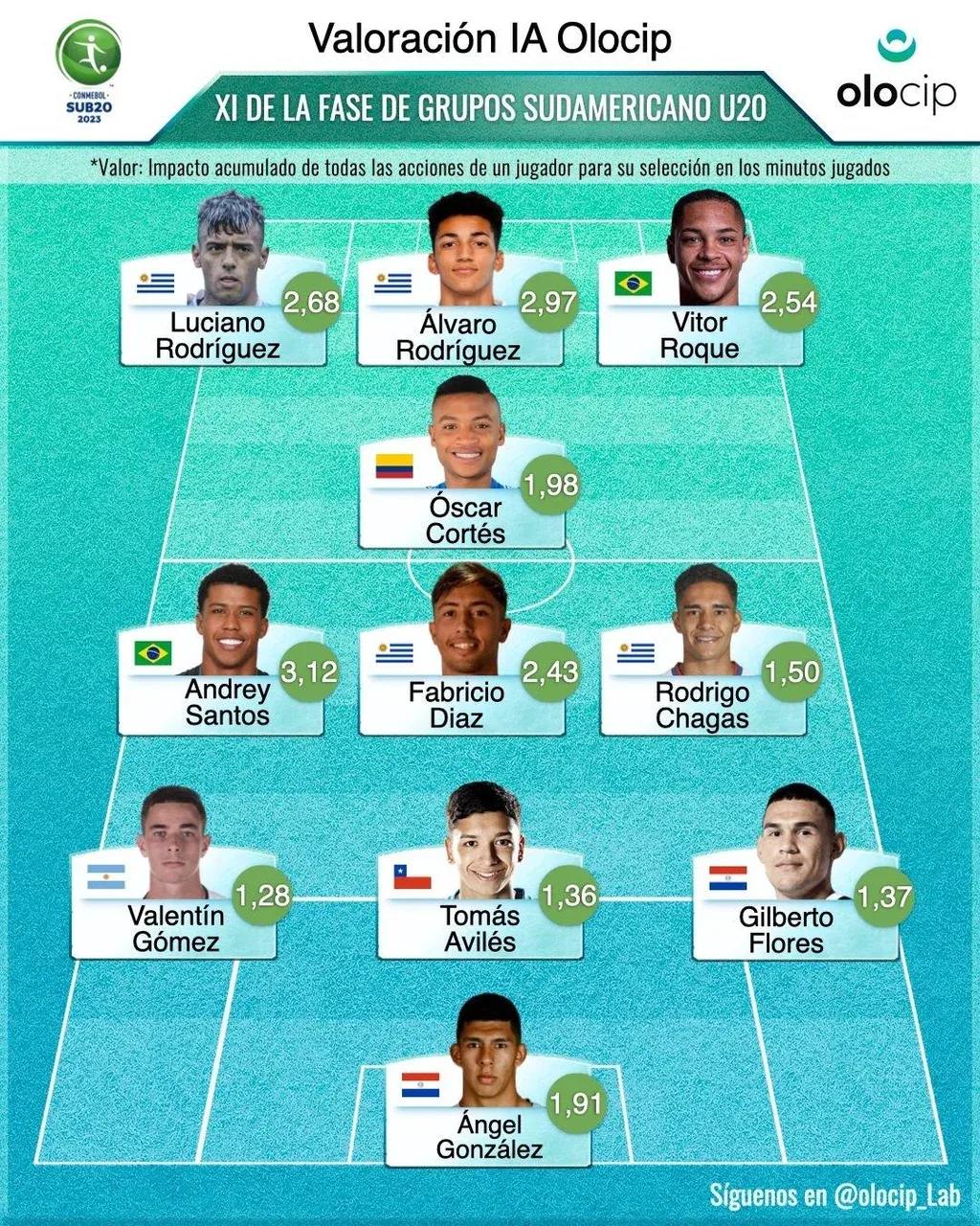 Olocip Uruguay domina el equipo ideal del Sudamericano sub 20, según la IA Los tres primeros jugadores celestes mencionados están entre los cinco goleadores del certamen, junto a los brasileños Vitor Roque y Andrey, todos con tres goles.