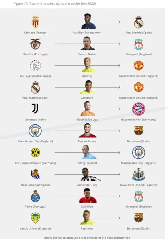 Ficharon en 2022 a seis de los diez jugadores más caros del año, con las llegadas de Darwin Núñez y del colombiano Luis Díaz a Liverpool, de los brasileños Antony y Casemiro a Manchester United, del noruego Erling Haaland al Manchester City y del sueco Alexander Isak a Newcastle.