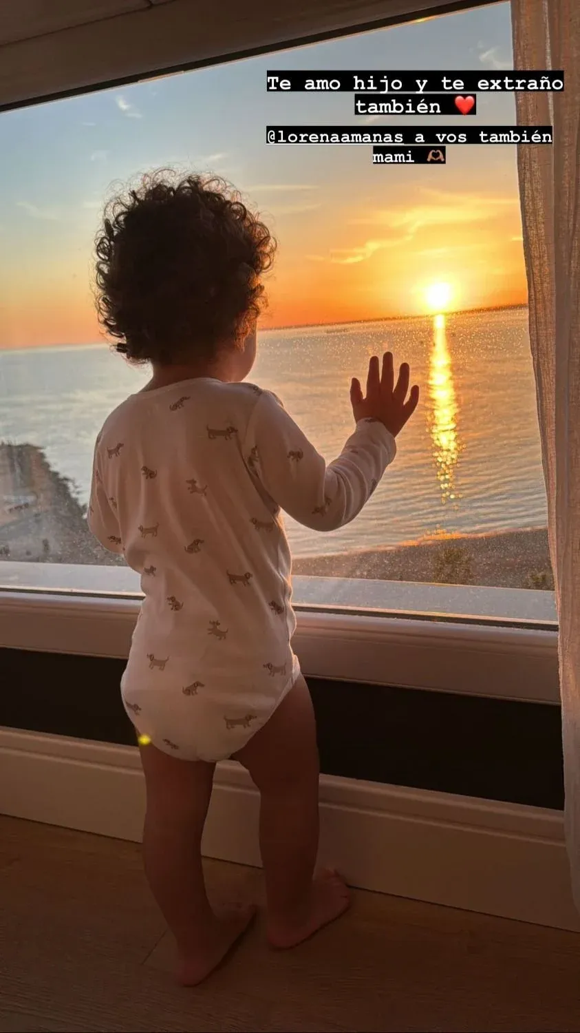 "Te amo hijo y te extraño también. Lorena Mañas a vos también mami", escribió el futbolista en una story de Instagram sobre una foto del niño mirando el sol a través de una ventaja.