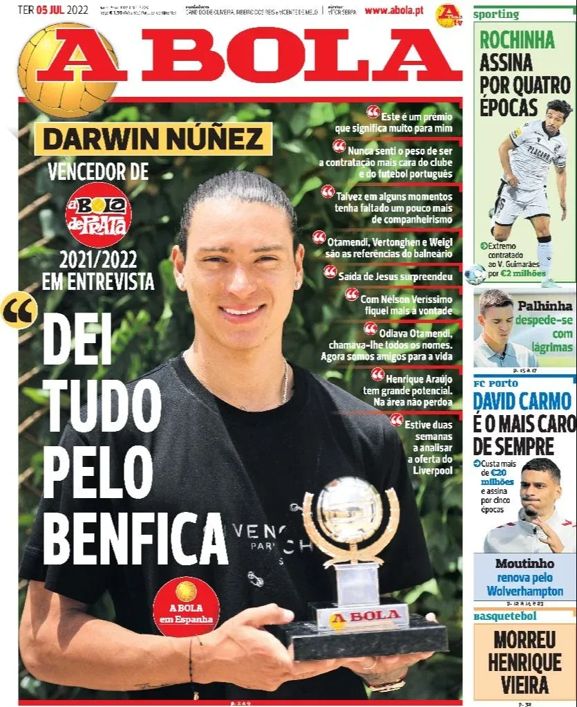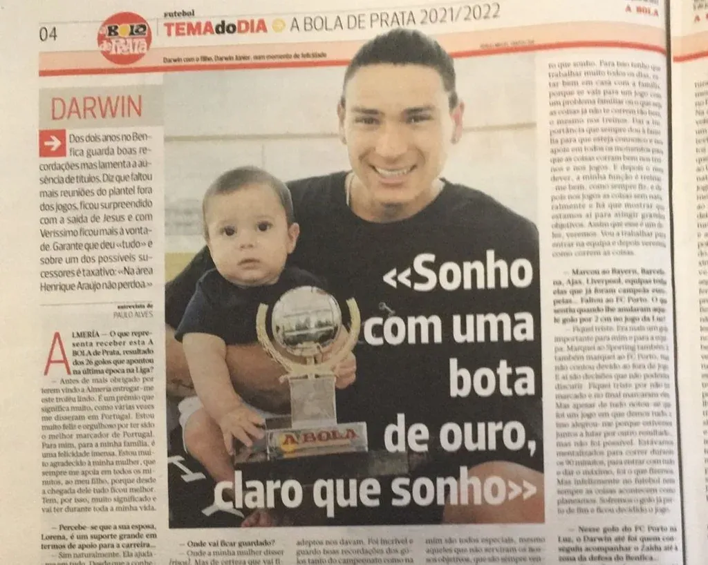A Bola Darwin y su bebé en la nota de cuatro páginas de A Bola “En ningún momento sentí ningún peso”, dijo. “Mi trabajo es jugar al fútbol, soy delantero y sé que tengo que hacer goles, pero creo que esa etiqueta no tuvo ningún peso en mi etapa en el Benfica”.