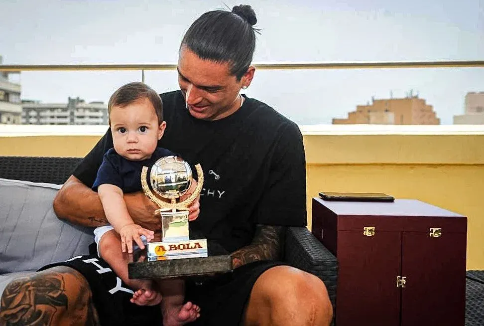 A Bola Darwin Núñez con su hijo y el premio de A Bola “Ella me ayuda en todo. Desde que la conocí, la verdad que me siento muy orgulloso por ella, es una mujer espectacular con un corazón enorme, tanto como su madre. Me ayudaron mucho”, comentó.