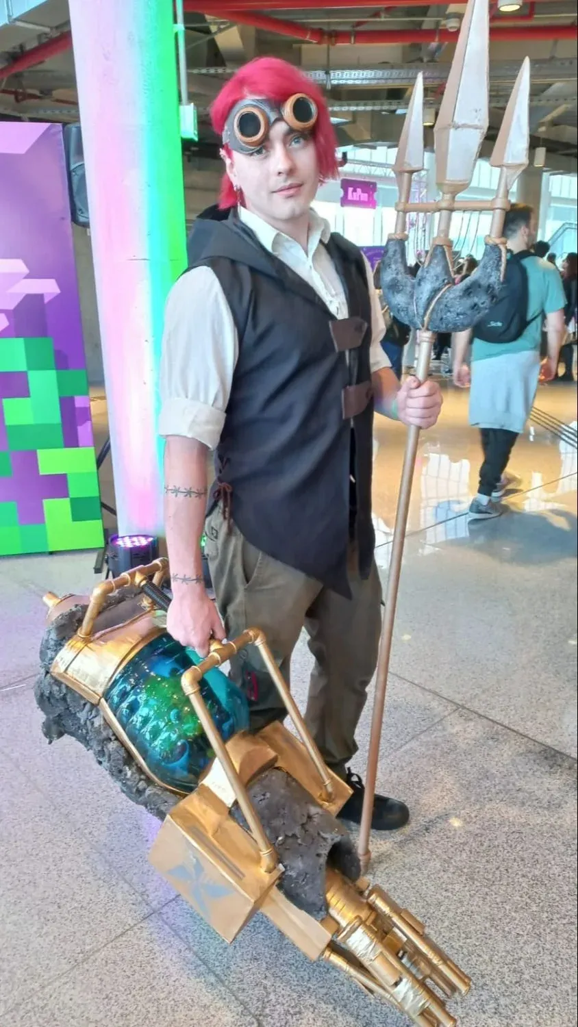 De la mano de su madre, para no perderse en la multitud que avanza lento por la Montevideo Comics 2023, un niño abre la boca y no la puede cerrar. Acaba de aparecer frente a su cara una especie de cañón ametralladora dorado. El chico que lo carga lleva en su otra mano un tridente. A las espaldas del niño, hay una persona disfrazada de Din Djarin —el protagonista de The Mandalorian— con un Baby Yoda en sus brazos. Entre la gente, dos jóvenes elevan sus carteles: uno ofrece abrazos gratis, el otro abrazos gratis pero metaleros.
