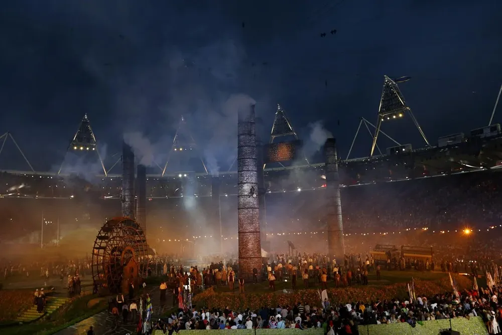De pronto, el rostro del actor Kenneth Branagh llena las pantallas. Con una galera dieciochesca y liderando a un grupo de señores inversores, decide levantar una fábrica. Al instante brotan del suelo cinco enormes chimeneas que tiran humo. Los cientos de campesinos se ven invadidos por otros cientos de obreros que entran por los costados y fabrican acero de colores. Forman un círculo que se eleva y se funde con los cinco anillos olímpicos. La revolución industrial como marca inglesa registrada. Luego vino la tragedia de la guerra, la oscuridad y la solemnidad, y luego el colorido y la frescura de los Beatles, los Who, los Rolling Stones, Queen, superponiendo canciones y años en que lo brit invadió en mundo con su mejor cara.