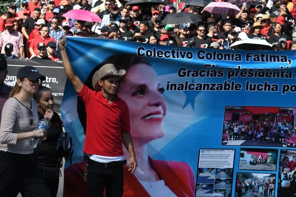En su discurso, la presidenta acusó a los gobiernos anteriores del ahora opositor Partido Nacional (PN derecha) de conducir el país a "un abismo, a la masiva migración" de hondureños hacia Estados Unidos, a la "pobreza, violencia y una deuda insoportable".
