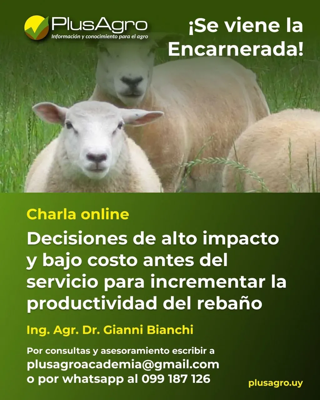 Está disponible en la página de plusagro.uy la primera de estas charlas, que contempla el conjunto de decisiones de alto impacto y bajo costo que se toman (o se deberían tomar) en torno a la encarnerada para maximizar la productividad de la majada.