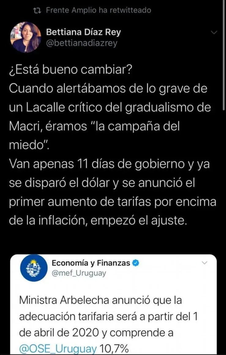 → Respecto al asunto de las tarifas de UTE, OSE y Antel, no quedan dudas de que era necesaria la suba. Lo increíble es la reacción de los responsables de dejar las cuentas públicas en rojo. ¿Así se manejará el Frente Amplio? ¿Cuanto peor, mejor? La actitud que la izquierda criticó de buena parte de la oposición en el pasado, ahora parece aplicarla. Un partido -y menos uno que estuvo en ese lugar hasta hace unos días- no puede alegrarse de que su adversario político tenga que tomar decisiones difíciles. Y mucho menos si en parte es su responsabilidad. Además, el anuncio del miércoles mostró algunas reacciones extremadamente preocupantes. Solo a modo de ejemplo, la cuenta oficial del Frente Amplio en Twitter compartió un montón de posteos críticos del gobierno, pero en uno de ellos una dirigente miente en dos cosas: le tira toda la culpa del aumento del dólar al nuevo gobierno y dice que el aumento de tarifas fue por encima de la inflación.