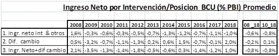 ¿Cual fue el costo de las intervenciones en Uruguay? Hace años las autoridades sostienen que el costo promedio es del orden del 1% del PIB. Esa cifra se aproxima a la diferencia de intereses y es errónea. Si incluimos la diferencia de cambios generada, el costo promedio en la última década (2008/2009 son años “atípicos” y deberían excluirse) es ligeramente menor (0,8%) pero con una alta volatilidad anual. Hasta 2013 el superciclo de nuestras exportaciones y una errónea política de tasa de interés dificultaron el trabajo del BCU y deterioraron sus resultados. Pos 2013, los resultados mejoran (ver cuadro).