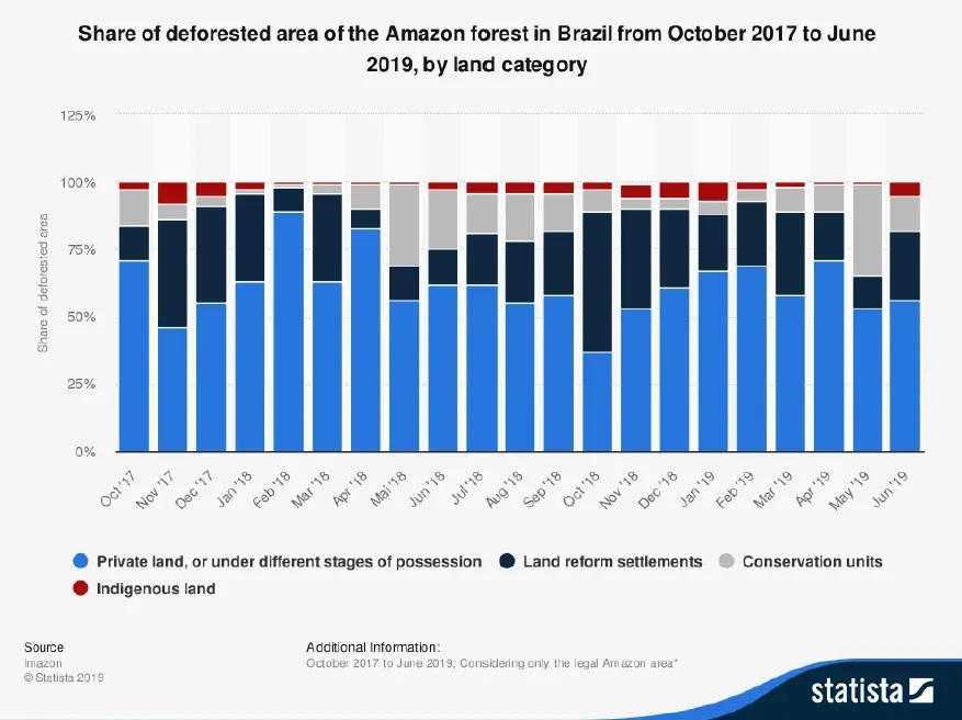Por otra parte, los focos de incendio en Brasil aumentaron un 85% entre 2017 y 2019, según datos de AFP. En junio de 2019 se destruyeron 801 kilómetros cuadrados de selva tropical y la mayor parte del área deforestada en la Amazonia brasileña ocurrió en áreas privadas, mientras que el 13% ocurrió en unidades de conservación.