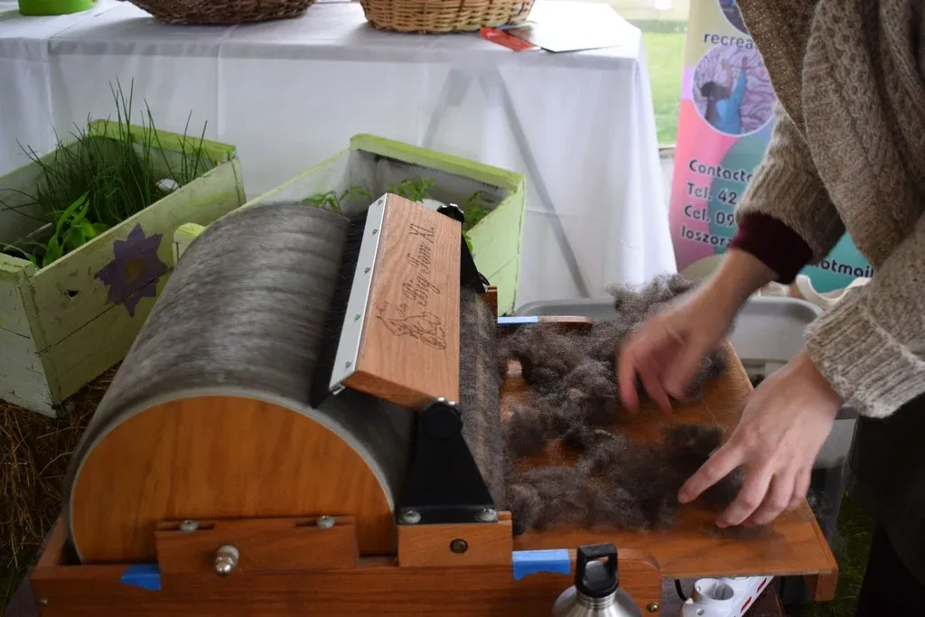 Junto con la rueca, Megan compró un cardador mecánico.