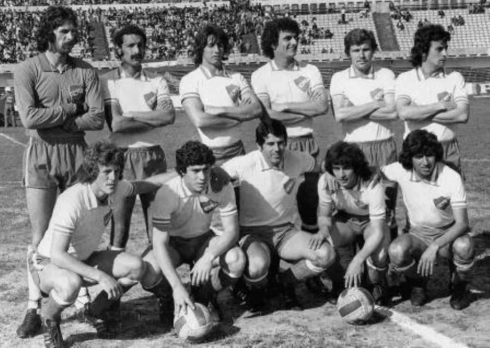 Este fue su segundo pasaje por Nacional en 1977: parados Rodolfo Rodríguez, Ruben Giménez, Alfredo De los Santos, Martín Taborda, Raúl Möller, Miguel Piazza; abajo, Alberto Bica, Juan Ramón Carrasco, Juan Carlos Mameli, Miguel Caillava y Juan Carlos Ocampo
