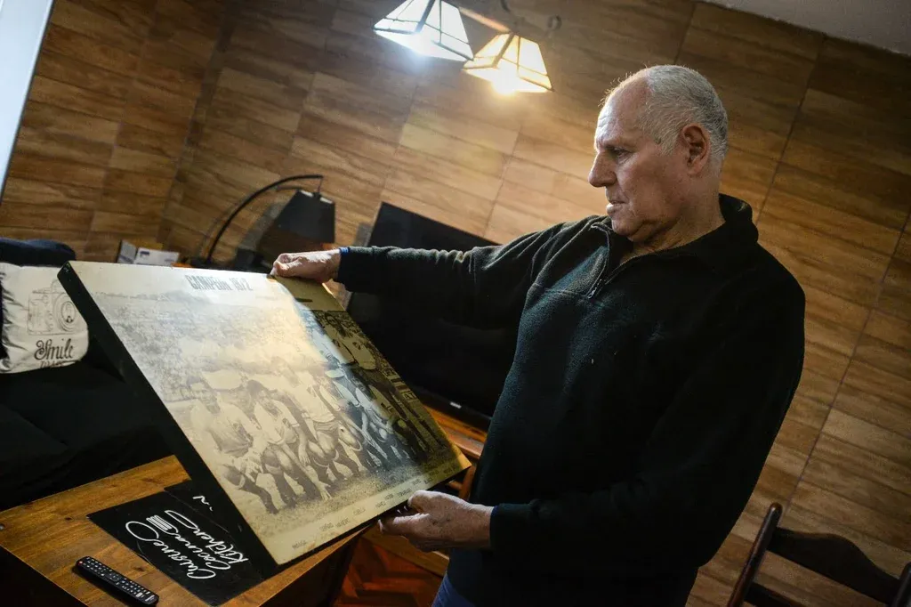 Palito con el cuadro que guarda de los campeones uruguayos de 1972
