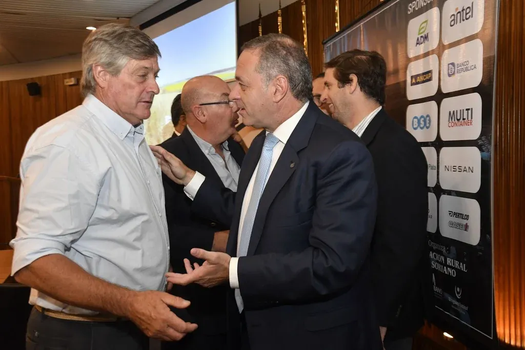 Foto: Leonardo Carreño. Guillermo Besozzi y Álvaro Delgado. "¿Qué contrasentido, ¿no?", dijo Delgado, dado que "estamos en el medio de una seca enorme, quizás la más grande de los últimos 50 años, en estos tres años de gobierno faltó un año de lluvias y sin embargo la producción agropecuaria, la tecnológica asociada al agro, la pecuaria y la agropecuaria en todas sus ramas ha tenido la voluntad, el compromiso, la inteligencia y la decisión de apostar a pesar de la coyuntura y mirar con luces largas”.