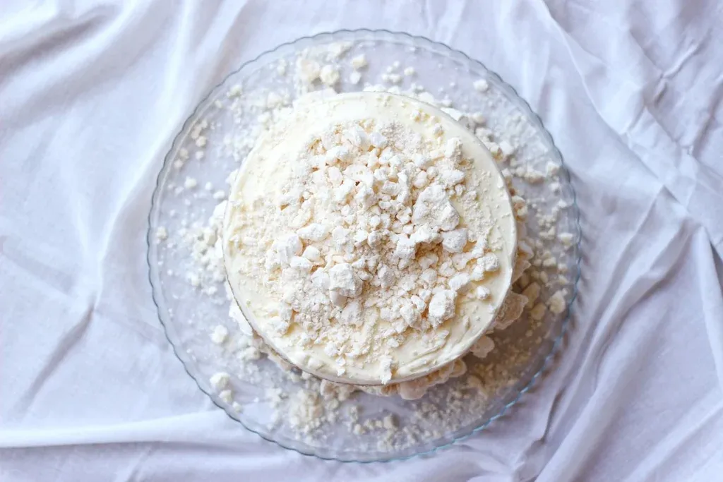 Romper los merengues groseramente y pegar un poco a los lados de la torta. Armar una linda montaña de merengues rotos en la cima.
