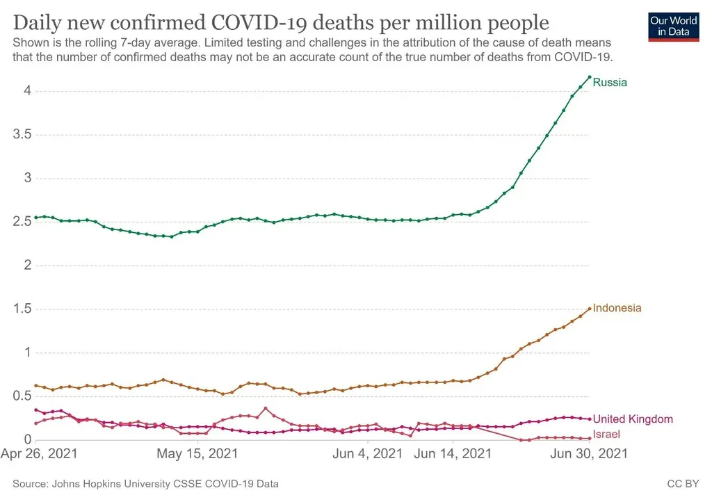En cuatro países donde ocurrió, las situaciones son distintas. Por ejemplo, en Rusia e Indonesia la cepa Delta determinó un aumento de contagios y de muertes, pero son países donde "no hay un buen plan de vacunación", señaló la científica. Como contracara de esa realidad, en Reino Unido e Israel los contagios también aumentaron debido a la variante, pero el número de muertes no se disparó.