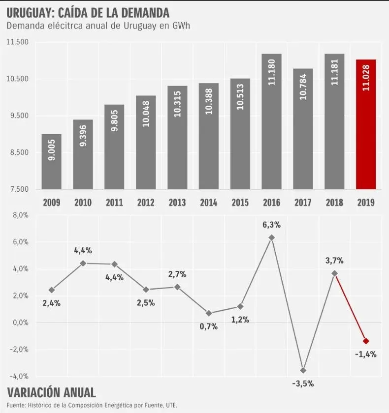 La demanda eléctrica cayó 1,4% en el país durante 2019 con respecto al año anterior, y se ubicó en 11.028 gigavatios por hora. Con excepción de 2017, la demanda de energía eléctrica en Uruguay venía creciendo sin parar desde 2004, y alcanzó un pico en 2016 cuando tuvo un aumento del 6,3% y 11.180 gigavatios por hora.