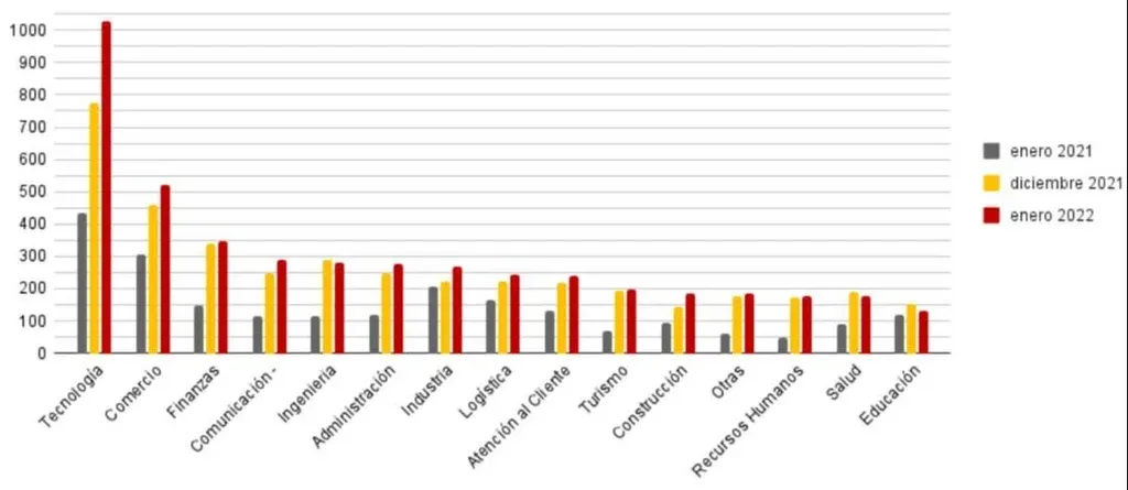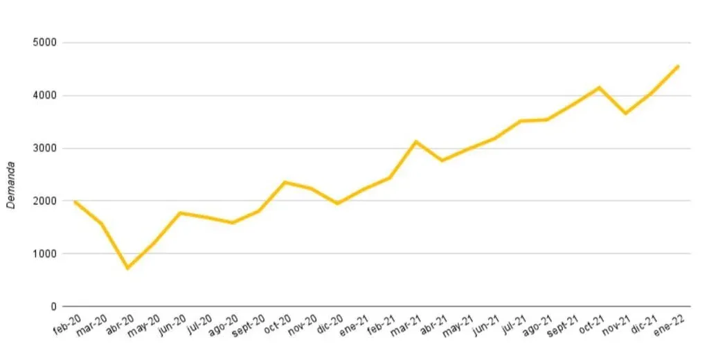 La demanda laboral creció 12% en enero de 2022 respecto a diciembre de 2021 y aumentó 105% en la comparación con el mismo mes del año anterior con una marcada búsqueda de perfiles con inglés.