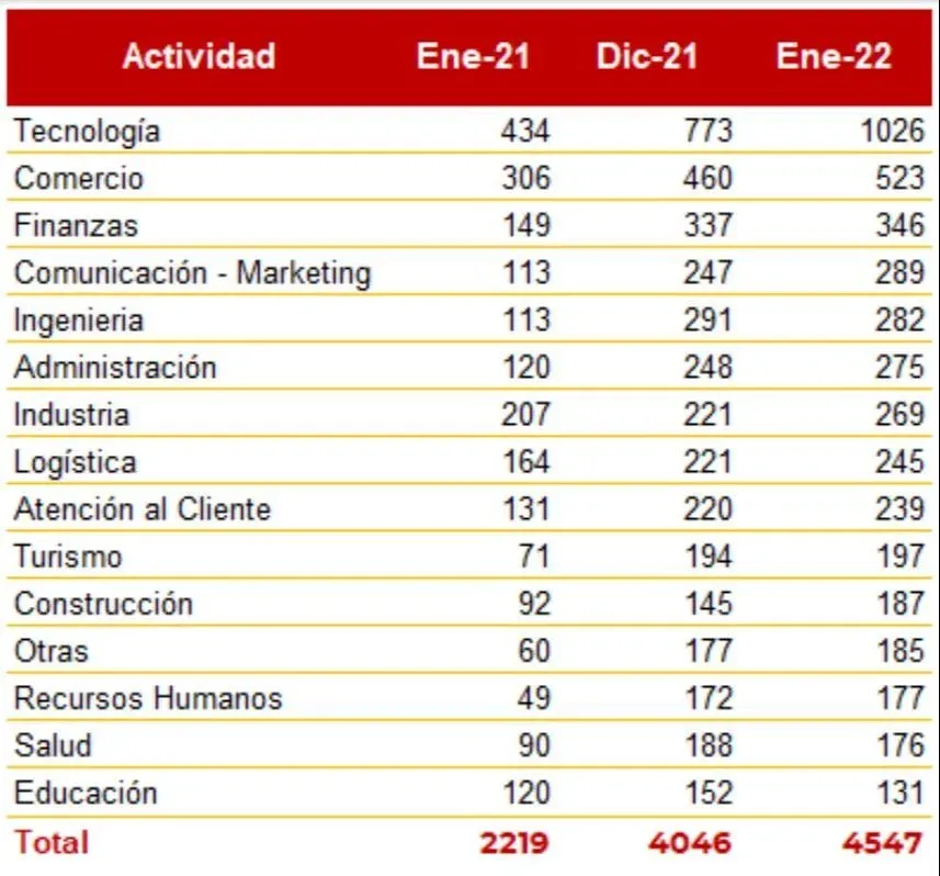 Todas las actividades aumentaron con respecto al mes anterior a excepción de educación que registró 21 oportunidades menos, salud, disminuyendo 6% e ingeniería que redujo las propuestas 3%.