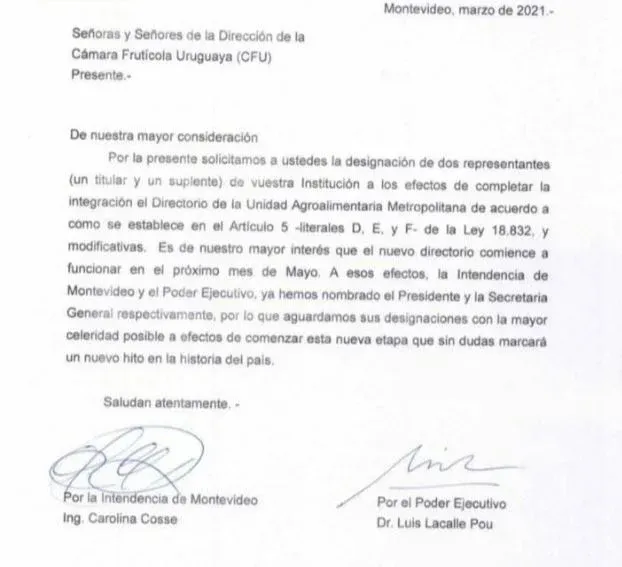 El presidente de la República –Luis Lacalle Pou– y la intendenta de Montevideo –Carolina Cosse– firmaron una carta conjunta en la que solicitan al sector de las gremiales hortifrutícolas la designación de sus representantes para avanzar en la conformación del directorio de la Unidad Agroalimentaria Metropolitana (UAM), el nuevo centro de comercialización donde se instaló el Mercado Modelo, que sigue siendo dirigido por un gobierno provisorio.