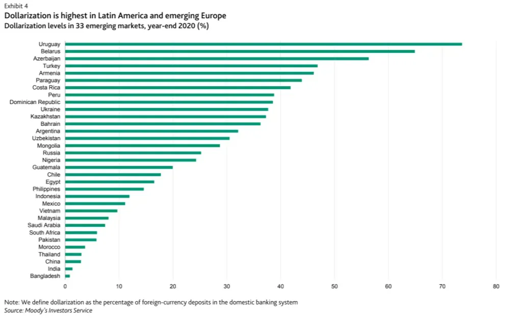 En América Latina, a fines de 2020, Uruguay tuvo el nivel más alto de dolarización con 74% de los depósitos, seguido por Paraguay, Costa Rica y Perú con 44%, 42% y 39%, respectivamente, según un informe de la agencia calificadora de riesgo Moody's. El organismo define la dolarización como el porcentaje de depósitos en moneda extranjera sobre el total en el sistema bancario doméstico.