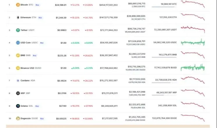 Según la información de CoinMarketCap, la cotización de Bitcoin cayó un 12% durante el último día para dejar su valor justo por encima de los US$ 24.000. Ethereum tuvo un rendimiento similar al registrar caída del 15% en las últimas 24 horas que dejó al activo con una cotización en los US$ 1200.