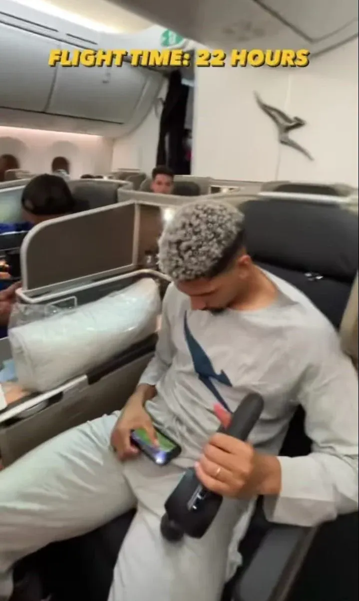 Además, aprovechó para realizarse masajes con un aparato personal. Cada jugador tuvo su compartimiento personal en el avión y a Araujo le tocó pegado al del brasileño Dani Alves.