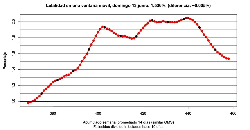 Con los datos al 13 de junio la letalidad se ubicó en 1,536%, cuando en el peor momento estuvo por encima del 2%. En el siguiente gráfico elaborado por el matemático e integrante del GACH Ernesto Mordecki se ve el descenso de este indicador.