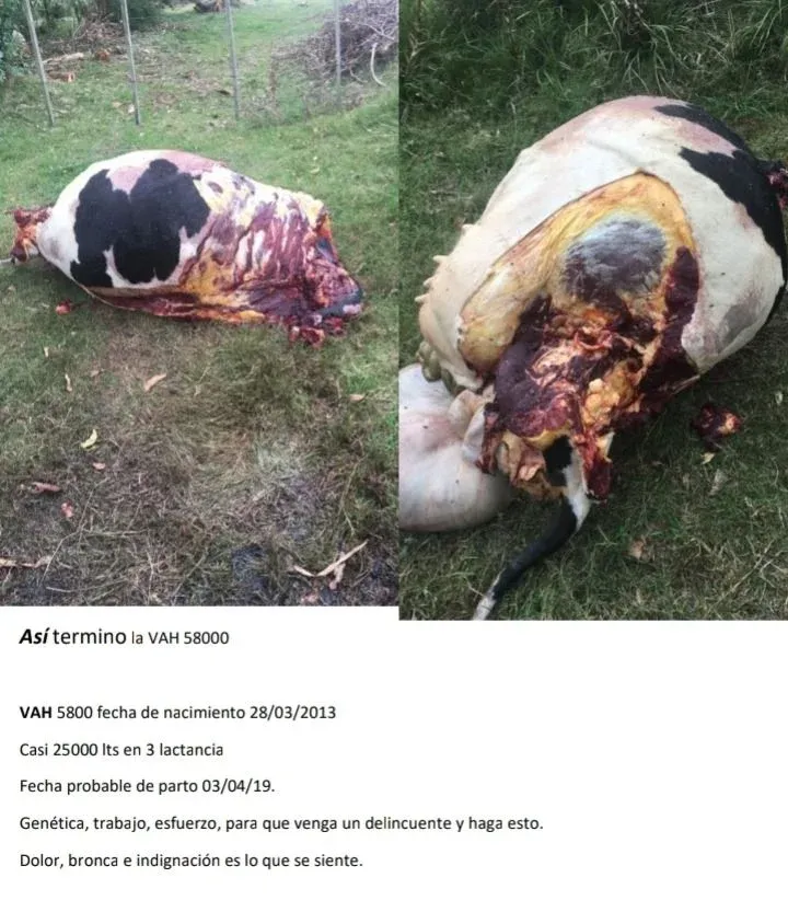 La víctima fue una vaca de la raza Holando de alto potencial productivo, ya que en tres lactancias había reportado casi 25.000 litros de leche. Ocurrió en un campo utilizado para la parición, donde se tiene al ganado seco (no en producción) que está próximo a parir.