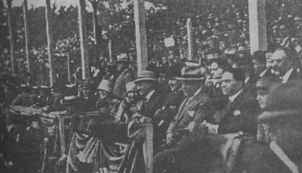 El presidente de la República, José Serrato, Héctor Rivadavia Gómez y Luis Alberto de Herrera, en el Palco Oficial del Gran Parque Central en el clásico que Peñarol le ganó 1-0 a Nacional en 1925