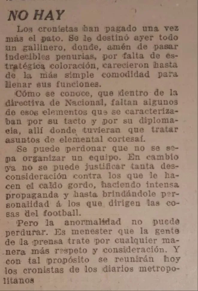 “No hay”, se titula una columna al otro día, que expresa: “Los cronistas han pagado una vez más el pato. Se le destinó ayer todo un gallinero, donde amén de pasar indecibles penurias, por falta de estrategia, carecieron hasta de la más simple comodidad para llenar sus funciones”. Y prosigue con fuertes comentarios en contra de los dirigentes tricolores de entonces.
