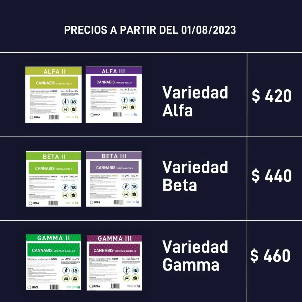 El Instituto de Regulación y Control del Cannabis (IRCCA) informó los nuevos precios en los paquetes de cinco gramos de marihuana que produce el Estado y que se vende en farmacias para las variantes Alfa, Beta y Gamma en farmacias.