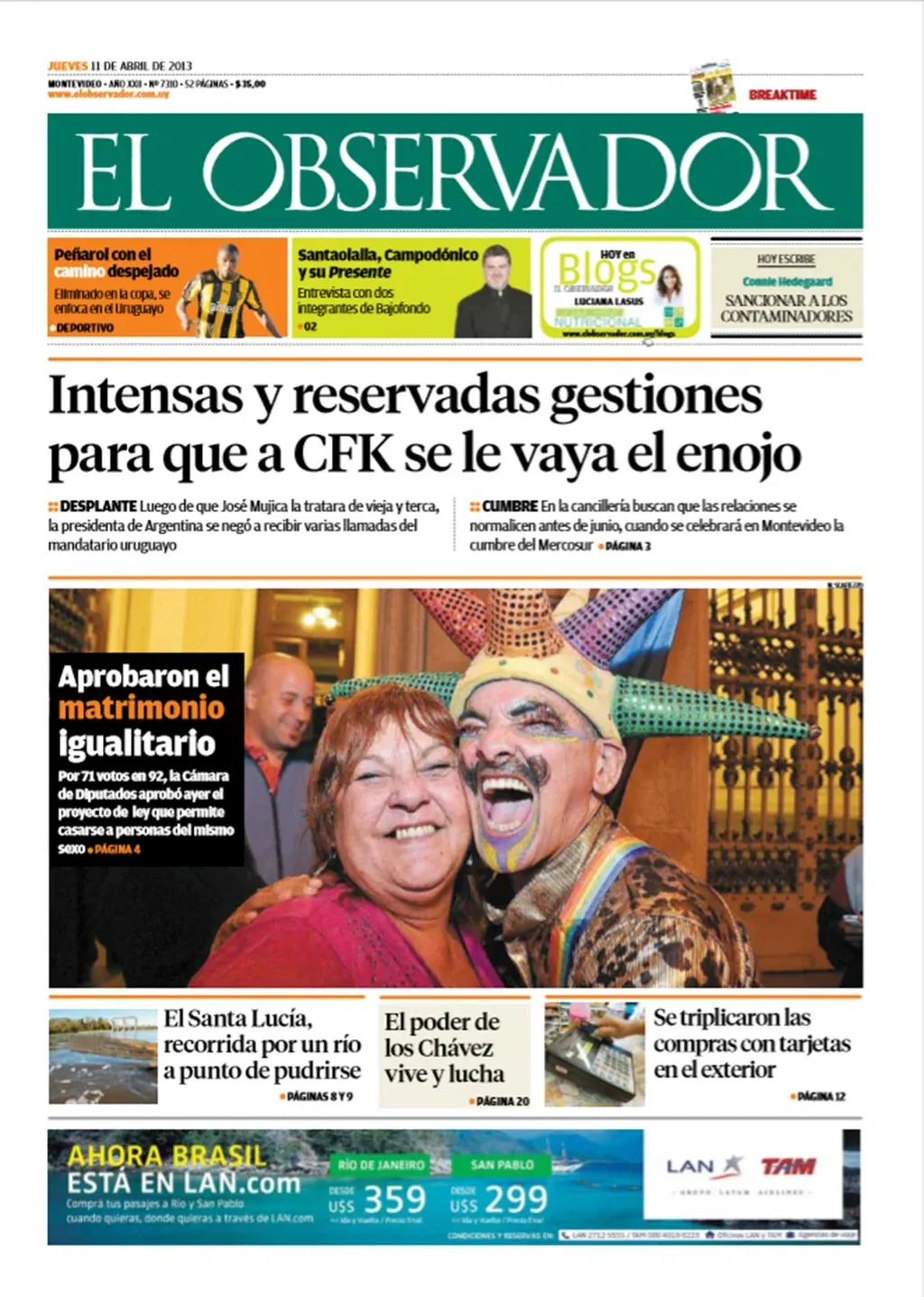 En la tapa del 11 de abril de 2017 se ve una foto de la diputada Daisy Tourné abrazada a un hombre con un gorro colorido festejando en la calle la aprobación del casamiento de personas del mismo sexo. Y la portada informa además que por esas horas se estaban realizando “Intensas y reservadas gestiones para que a CFK se le vaya el enojo”, enojo que le había sobrevenido porque en su estilo lenguaraz, Mujica la había tratado de vieja y terca en una conversación que se filtró en un micrófono abierto en un acto público.