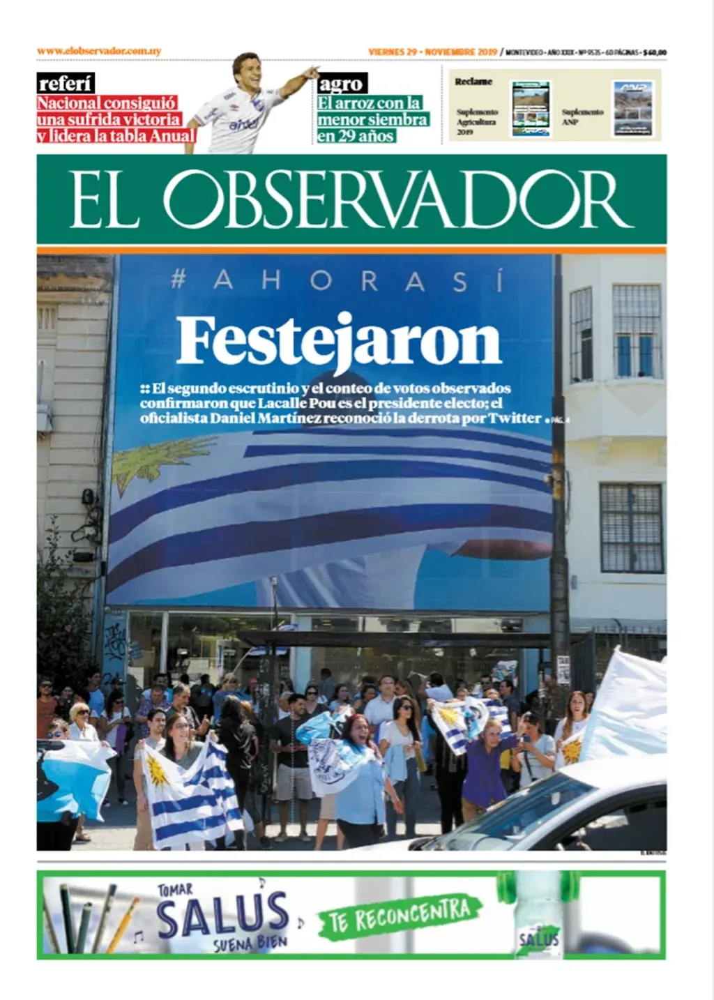 Recién el viernes 29 de noviembre con un “Festejaron”, y la foto de la sede de campaña de Luis Lacalle Pou, El Observador pudo anunciar el fin de esa era frenteamplista puesto que, hasta que no se realizó el escrutinio secundario, Martínez se negó a reconocer una derrota en las urnas que las posibilidades matemáticas ya habían decretado.