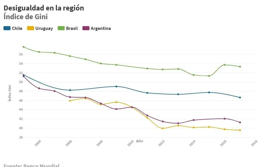 Chile mejoró la distribución del ingreso en este siglo, pero a partir desde 2011 ese indicador está prácticamente estancado. Si se compara con Uruguay -no es antojadizo que esté graficado a partir de 2006 porque ahí comienza la serie del Banco Mundial-, a nivel local la reducción fue más pronunciada.