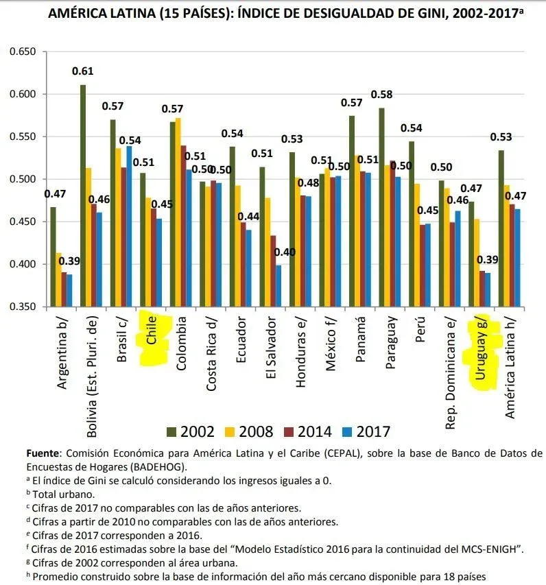 Es verdad que Chile mejoró sustantivamente en el indicador de desigualdad en los últimos 20 años, pero junto a México sigue siendo el peor de los países de la OCDE, y está por debajo de Uruguay y de Argentina en la región -aunque el dato de Argentina hay que tomarlo con pinzas porque se refiere a ingresos urbanos-.