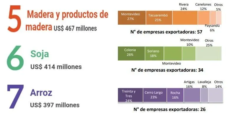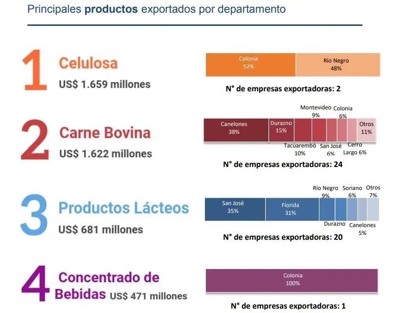 El restante 40% proviene de los restantes 15 departamentos, con Río Negro despegado de los demás con 10% gracias a la planta de UPM.