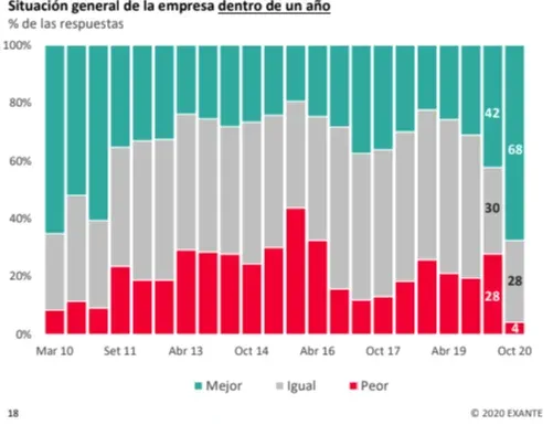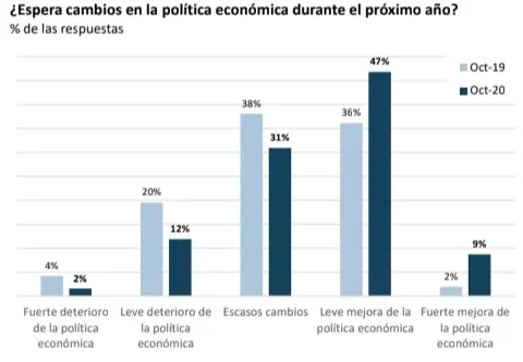 Por primera vez desde 2014 volvieron a ser mayoría quienes consideran que el clima de inversión es bueno o muy bueno. En la misma línea, mejoraron las expectativas respecto a 2021: 73% de los más de 300 ejecutivos consultados considera que la situación económica será mejor al cabo de un año, mientras que las opiniones positivas sobre la evolución del clima de inversiones en los próximos 12 meses ascendieron a 67%.