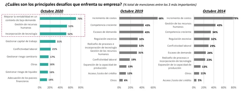 Los ejecutivos identifican a la mejora de rentabilidad en un contexto de baja demanda como el principal desafío de sus empresas el próximo año. También vale notar que el desafío de incorporación de tecnología apareció entre los más mencionados por primera vez desde que Exante realiza estos relevamientos.