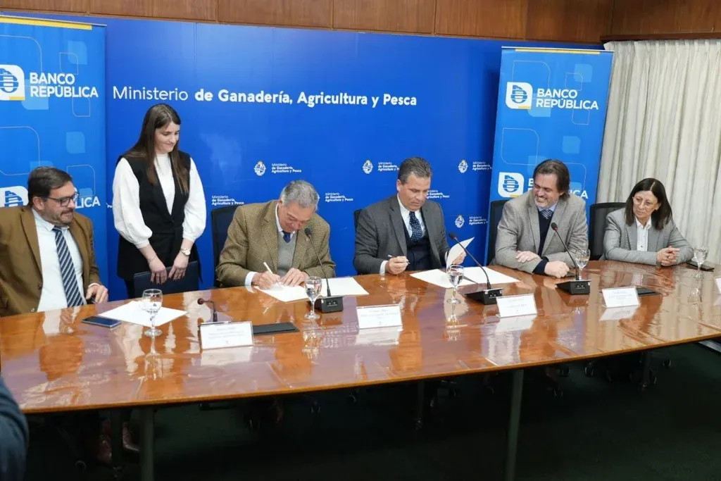El acuerdo fue firmado por el ministro de Agricultura, Ganadería y Pesca, Fernando Mattos, el presidente del Banco República, Salvador Ferrer, y la gerente general de la institución, Mariela Espino.