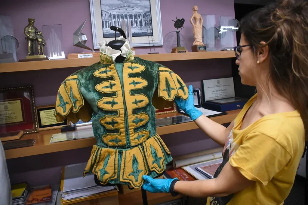 Sobre una mesa larga acomoda carpetas con bocetos de vestuarios y escenografías de distintas épocas. Dibujos que al mismo tiempo cuentan la evolución del reconocimiento, la profesionalización y el protagonismo de los rubros técnicos. En otro sector del teatro, en una serie de maniquíes, se preparan las piezas de ese mismo vestuario que estarán en exposición el fin de semana. Charlo levanta un cobertor y descubre el vestuario masculino que usó Zorrilla en Don Gil de las calzas verdes. “Vemos que le faltan las mangas, tiene las charreteras pero las mangas no están”, observa mientras señala la fotografía.
