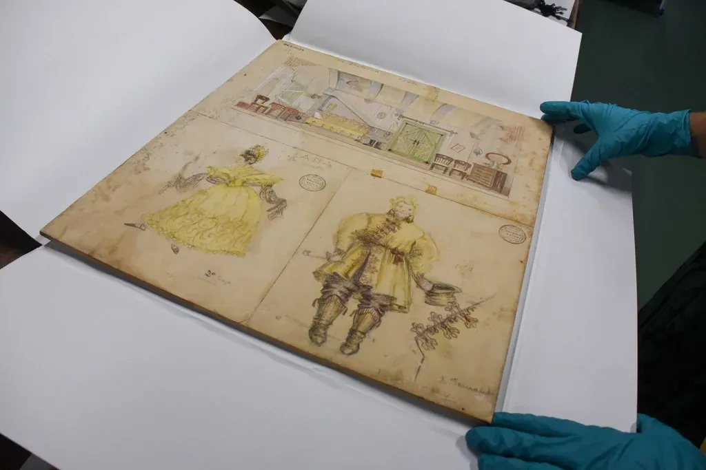 Esa historia documental de las piezas se da como un diálogo: el texto, el vestuario, los bocetos, el programa, las fotos, son las piezas de un relato en reconstrucción. "Es muy complejo ese reconocimiento. Existe el boceto pero no da la certeza de que se haya hecho, ni de que se haya hecho igual a como está. En el boceto de escenografía tiene un boceto de vestuario que también es de China y dice ‘segundo traje’ y este es el segundo traje que dice que no se hizo. ¿Qué pasó acá?".