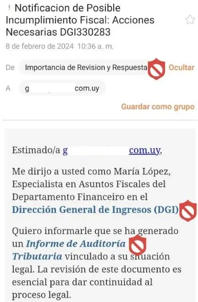 Los mails tienen como asunto “notificación de posible incumplimiento fiscal”, y están escritos por alguien que se presenta como María López, quien dice ser “especialista en asuntos fiscales del Departamento Financiero en la Dirección general de Ingresos (DGI)”.