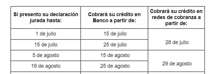 En el siguiente cuadro puede ver el calendario de cobro de créditos de acuerdo a la fecha en la que se presente la declaración.