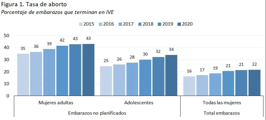El enfoque contable consiste en descomponer el crecimiento de los nacimientos considerando la variación en los embarazos y abortos. Tres causas inmediatas de la caída en la natalidad emergen de este análisis. Primero, hay menos embarazos planificados en mujeres adultas (contribución de 44% a la caída de los nacimientos desde 2015). Segundo, la baja en los embarazos no planificados, más en adolescentes (23%) que en mujeres adultas (16%). Tercero, hubo un crecimiento en el porcentaje de embarazos que culminan en abortos (tasa de aborto) que explica 15% de la caída en la natalidad. Un comentario respecto a esto último: de no haber mediado cambios la tasa de aborto, estos habrían caído aproximadamente 20% en el período (junto con los embarazos). Sin embargo, la tasa de aborto creció considerablemente en el período (ver Figura 1), a tal punto que no solo el número de abortos no disminuyó entre 2015 y 2020, sino que creció 6%.
