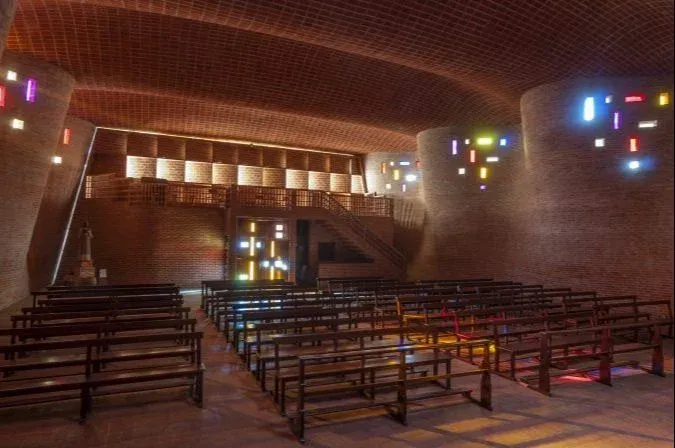 Complementan la iluminación del ámbito, una serie de pequeños huecos dispuestos en las partes superiores de los muros curvos, en los que se colocaron vidrios coloreados. Todo ello incide, sin duda, en la sensación de paz y espiritualidad que invade a quien accede a la Iglesia.