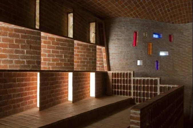 El ladrillo es el material utilizado en pisos, paredes y techos, generando curvaturas que otorgan movimiento, a la vez que proporcionan la suficiente rigidez para sostener y configurar un espacio acogedor, íntimo y que inspira a la reflexión. De esta forma, los muros parten de una línea recta en su base y comienzan a curvarse progresivamente.