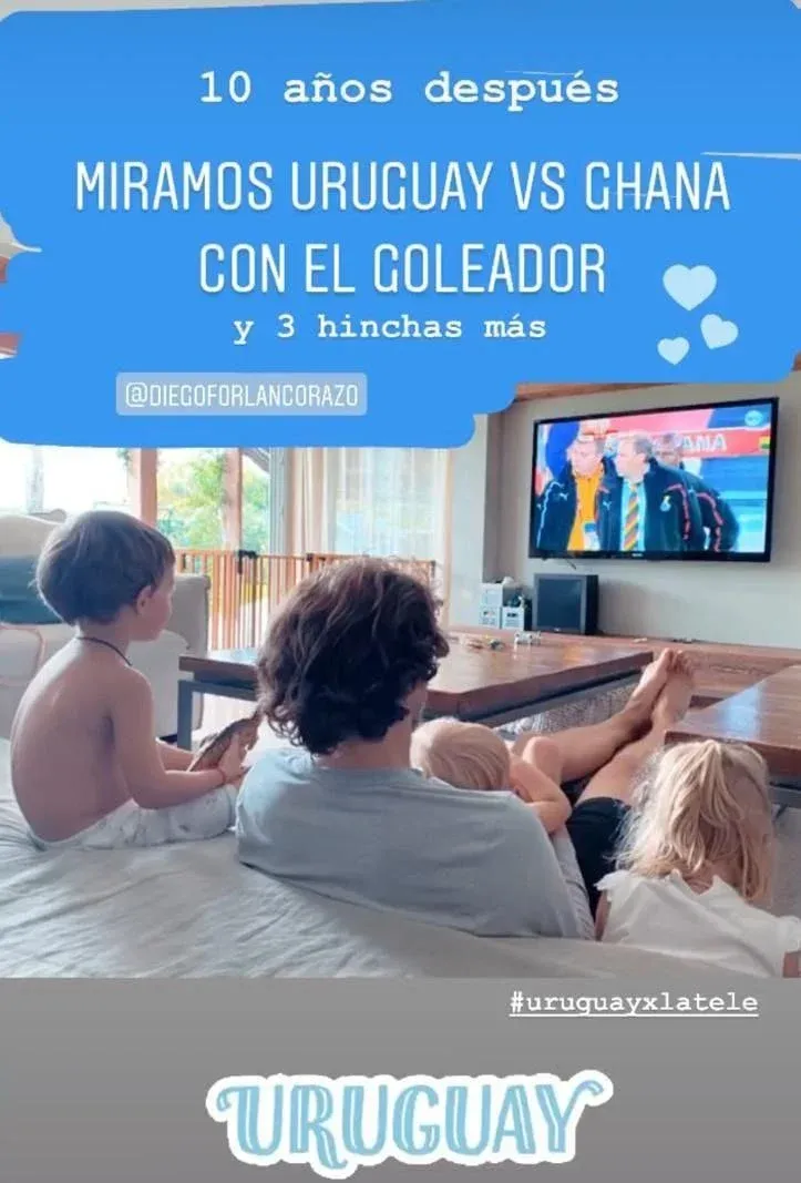 "Miramos Uruguay vs. Ghana con el goleador", posteó Paz en Instagram en una foto en la que aparecen los tres niños y Diego muy atentos al televisor.