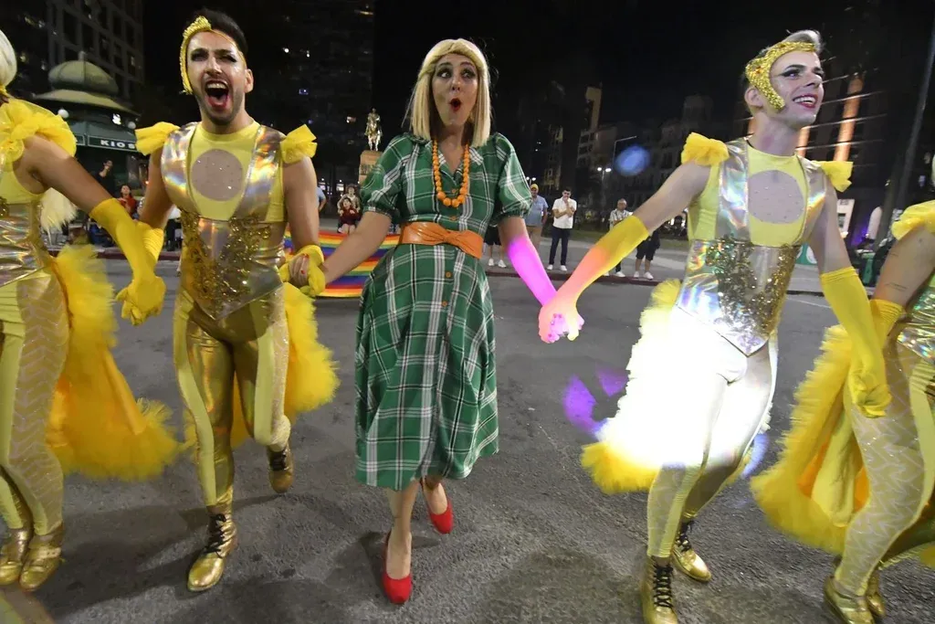 Los Muchachos avanzan en el con la presentación de Fabrizio Silvera como Freddie Mercury y la voz de Damian Lescano en un espectáculo que abordará la diversidad en el carnaval: Orgullo. Denise Casaux y Leticia Cohen desfilan en el centro de la avenida y una señora las mira pasar mientras ensaya una serie de pasos de baile imitando a los bailarines.