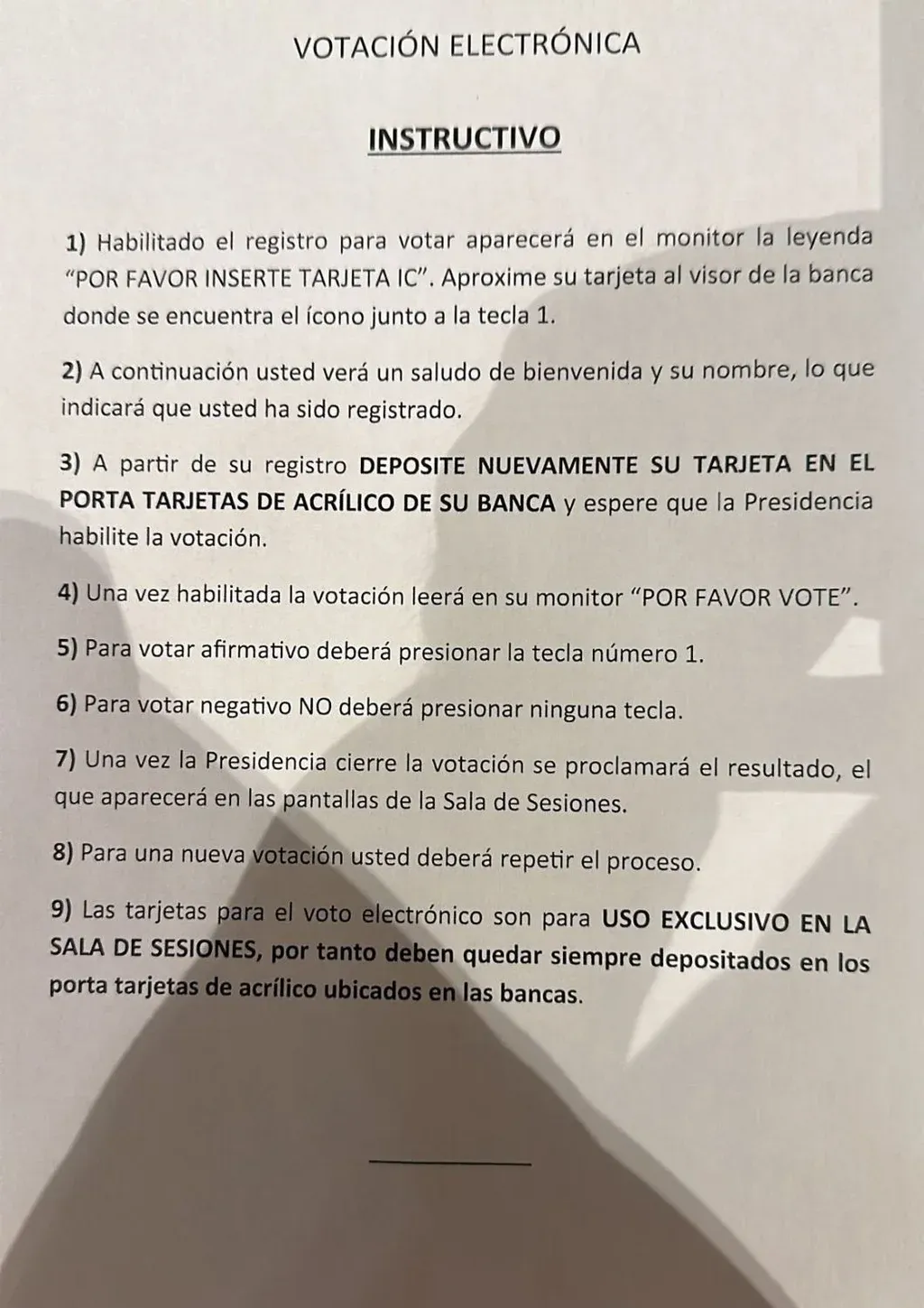 El documento, al que accedió El Observador, señala que una vez que se habilite el registro para votar, los legisladores verán en su monitor una leyenda que dice "por favor inserte tarjeta IC". Deberán aproximar la tarjeta junto a una tecla y luego recibirán una señal que indicará que quedaron registrados.